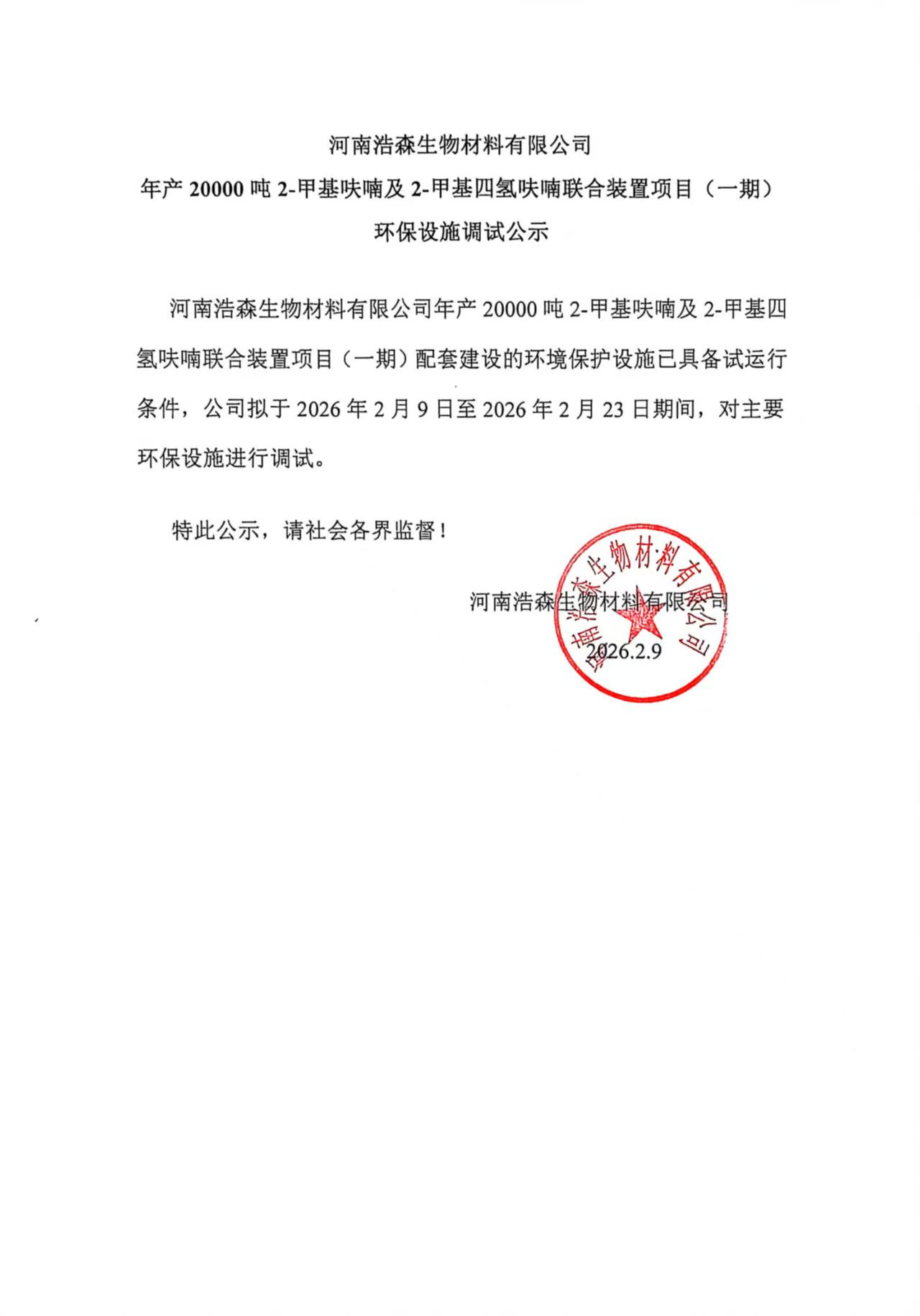 河南浩森生物材料有限公司 年產(chǎn)20000噸2-甲基呋喃及2-甲基四氫呋喃聯(lián)合裝置項(xiàng)目(一期) 環(huán)保設(shè)施調(diào)試公示